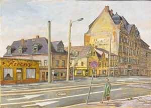 - Joachim Scholz – „Georg-Schuhmannstraße/ Ecke Lindenthaler Straße“, Mischtechnik auf Papier, 42 x 59 cm, 1989.