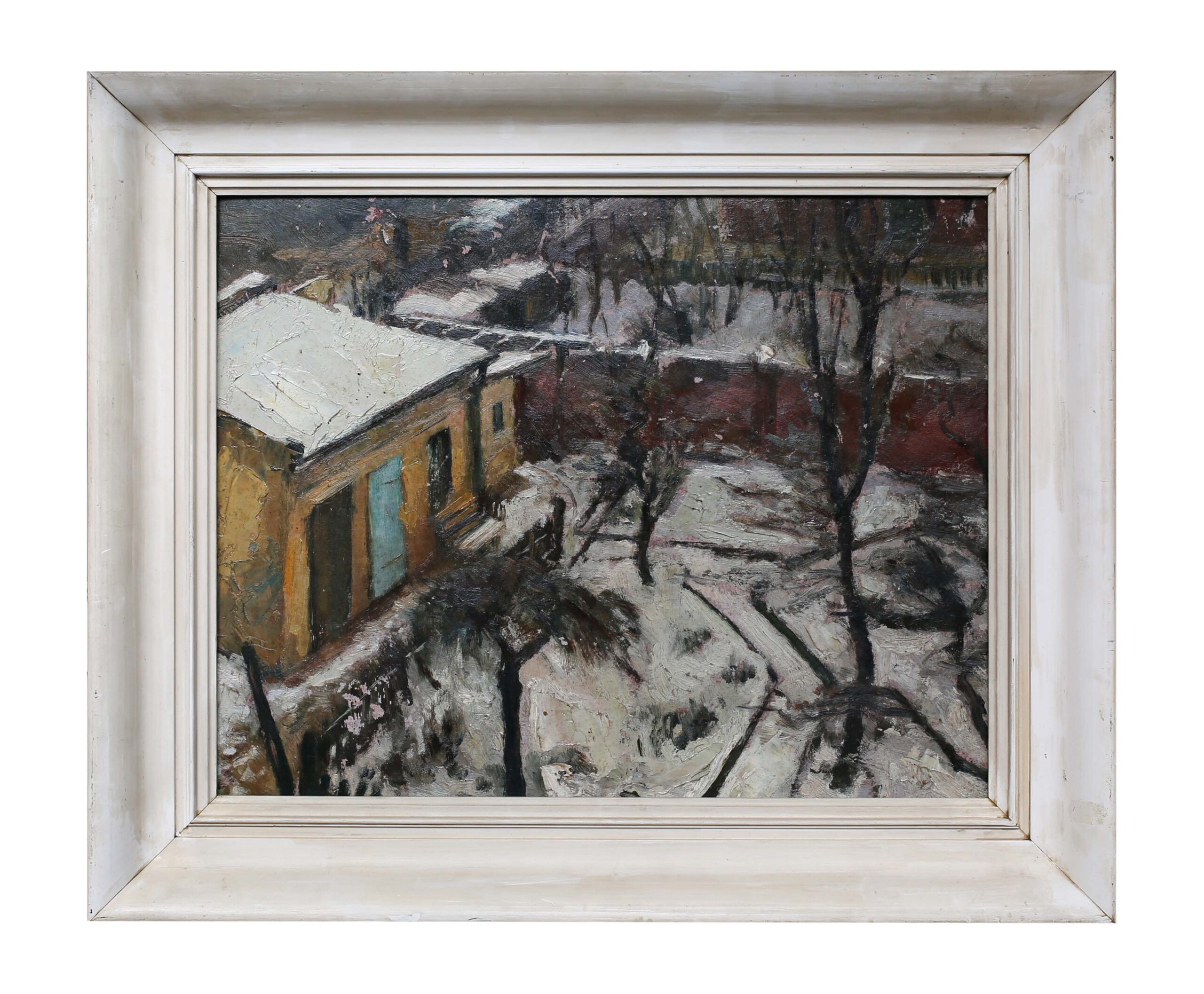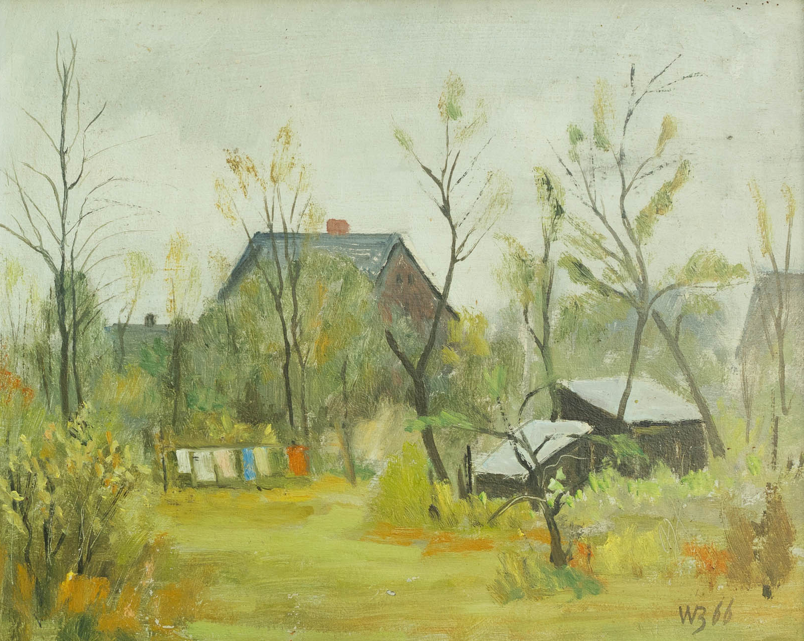 - Karl Miersch – „o.T. – Kleingärten“, Öl auf Hartfaser, 33,2 x 43 cm, 1960er Jahre.