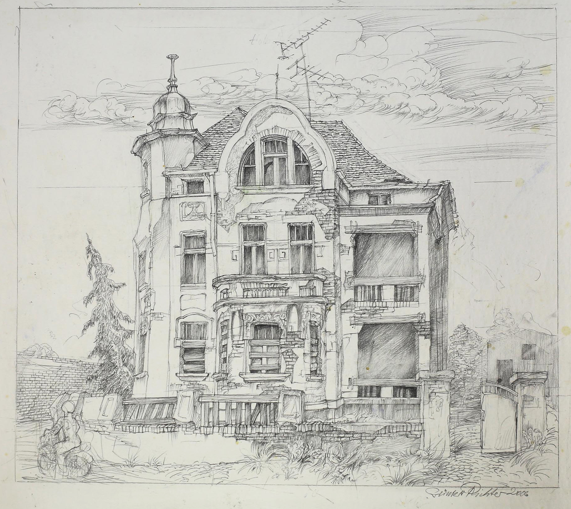 - Günter Richter – „Villa zum blauen Affen“, Bleistiftzeichnung, 41 x 45 cm, 2006.