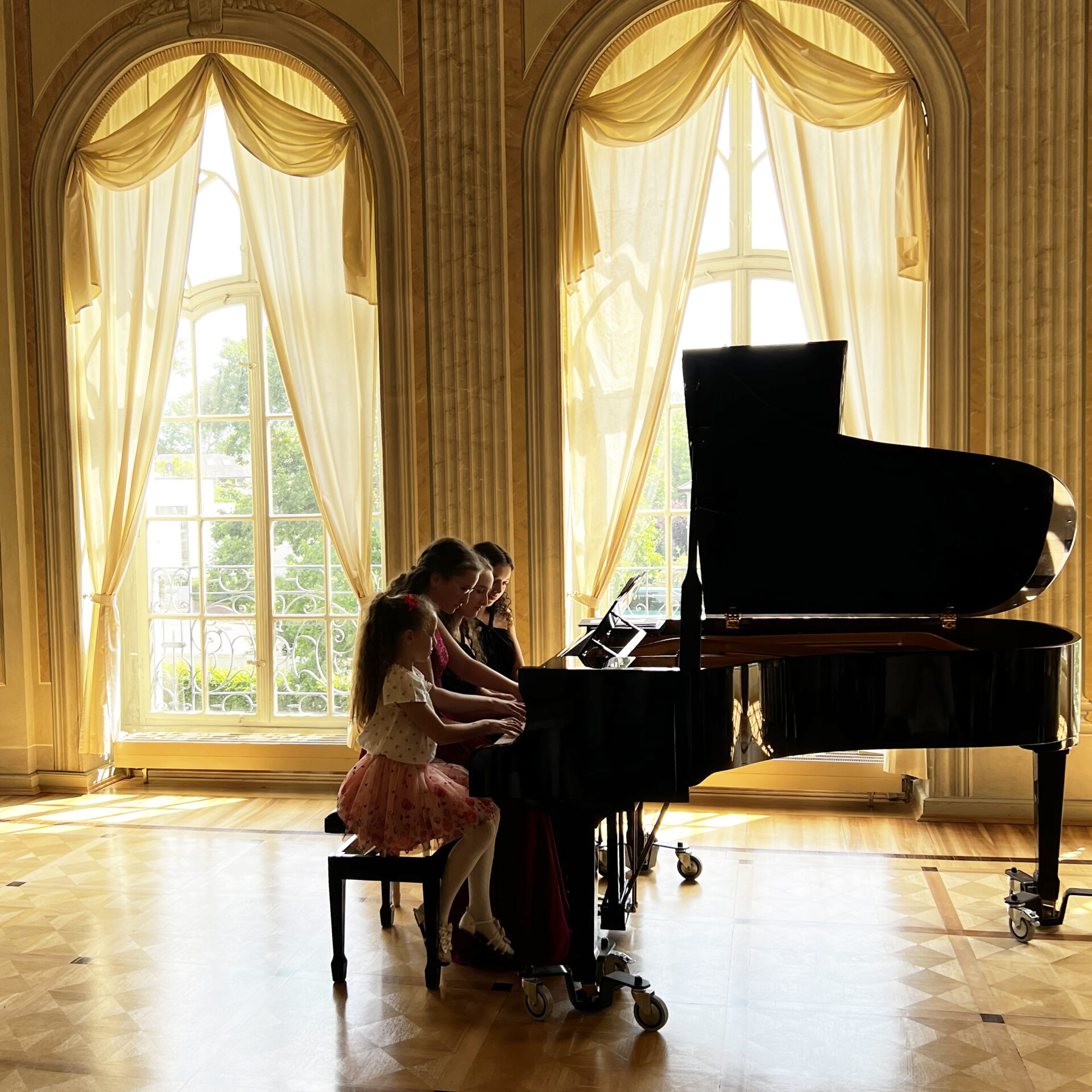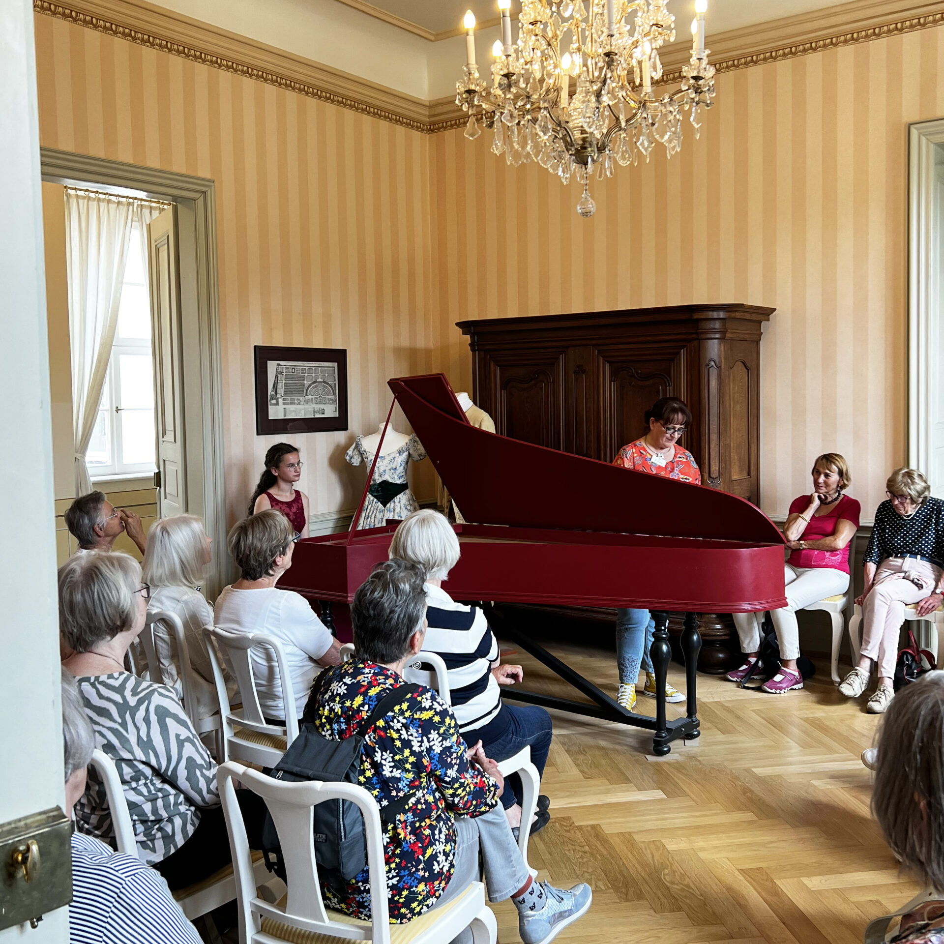 Die amüsante und zugleich kurzweilige Tour vermittelt Wissenswertes zur Geschichte des Hauses, führt Sie durch die verschiedenen prächtigen Festsäle und Salonzimmer und Sie hören musikalische Beispiele aus verschiedenen Musikepochen vom Barock zur Klassik, über die Romantik bis hin zur Moderne. Gespielt wird auf einer Kabinettorgel aus dem frühen 19. Jahrhundert, einem Cembalo und auf unserem Blüthner-Flügel.
